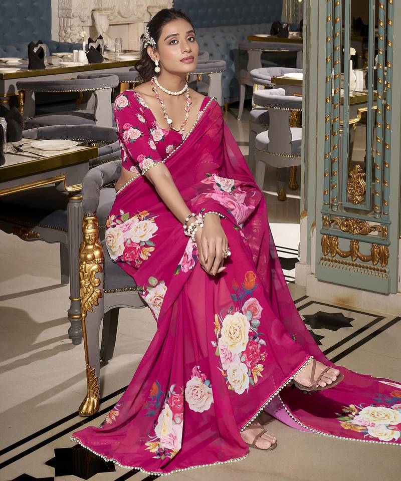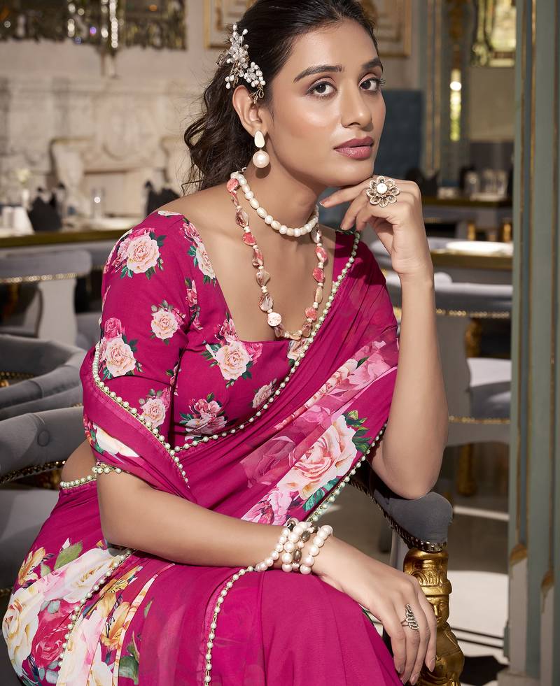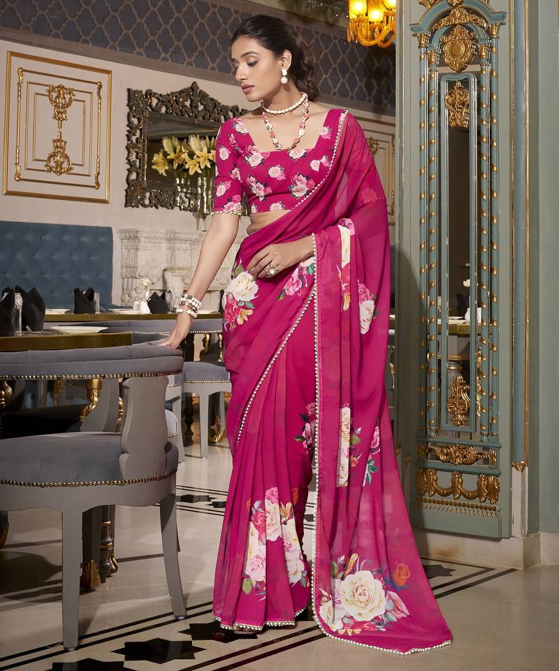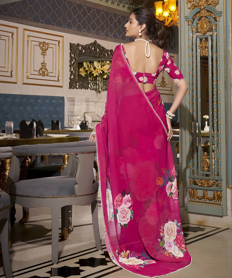 | Product Name | Pink Spectacular Georgette Printed With Pearl Lace Saree With Unstitched Blouse | |