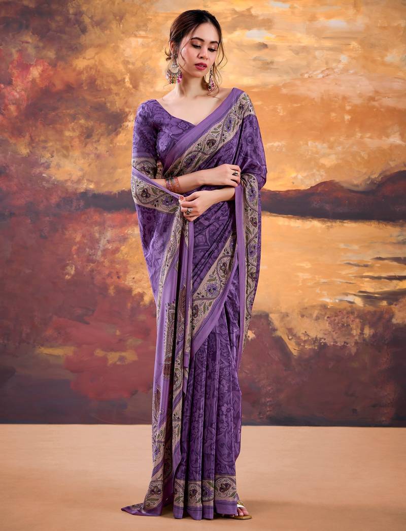 | Product Name | Purple Crepe Printed Saree With Unstitched Blouse | |