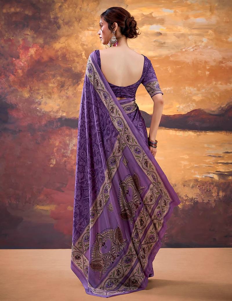 Purple crepe printed saree with unstitched blouse