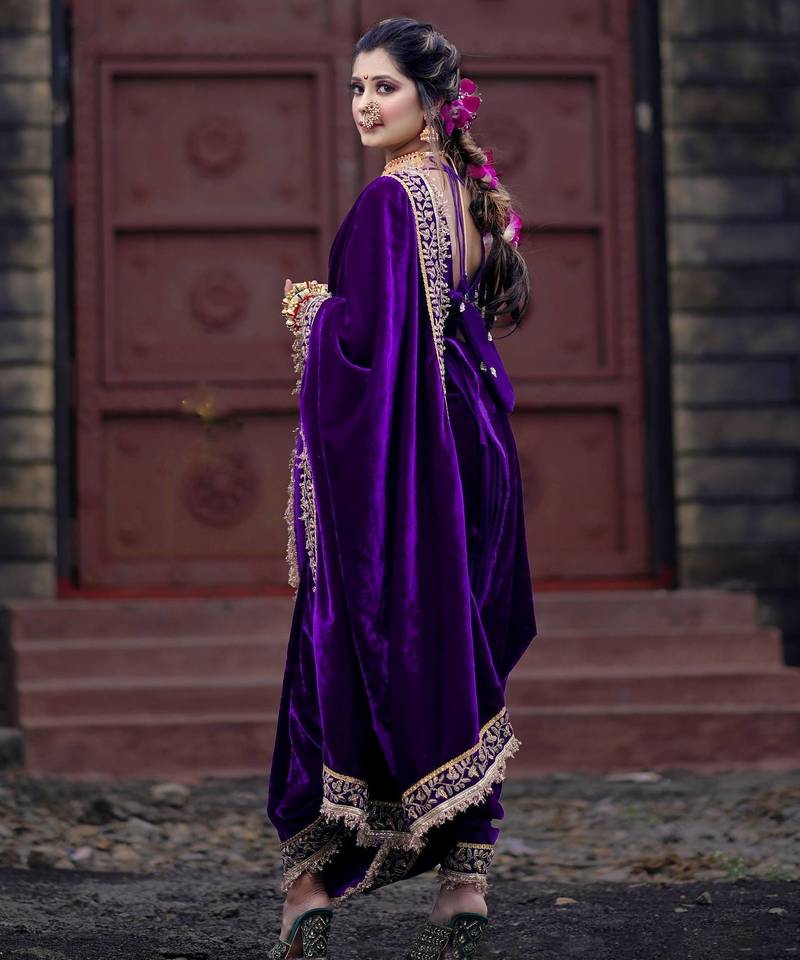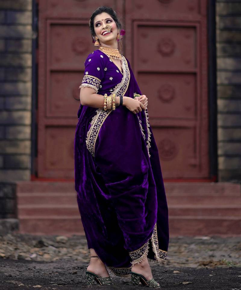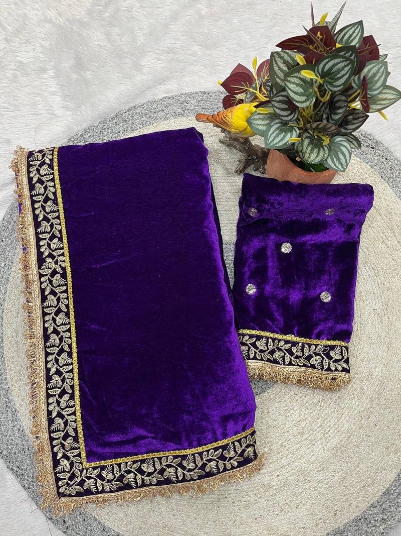 | Product Name | Purple Velvet Zari Dori Thread Embroidery Work With Fancy Fark Border Saree | |