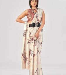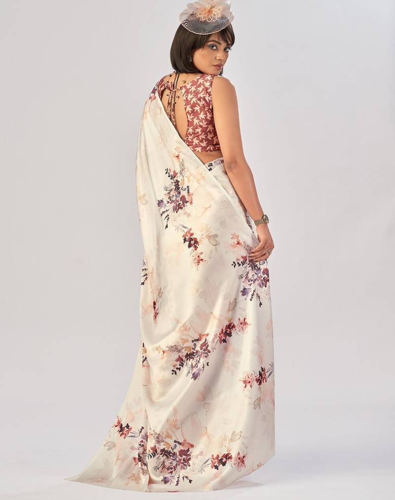 White satin silk elegant printed saree with unstitched blouse