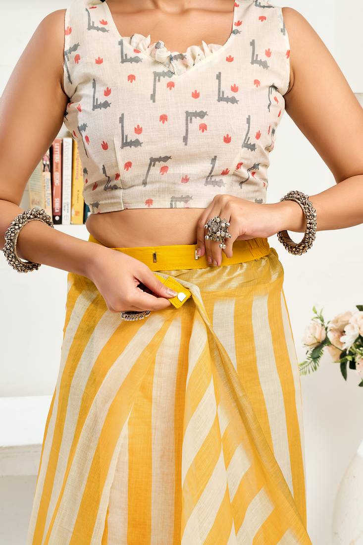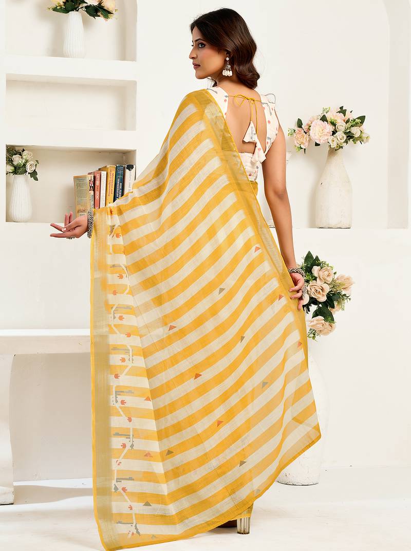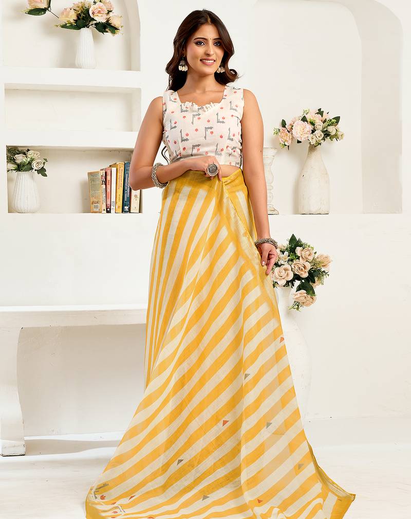 | Product Name | Yellow White Digital Printed Linen Ready To Wear Designer Saree With Unstitched Blouse | |