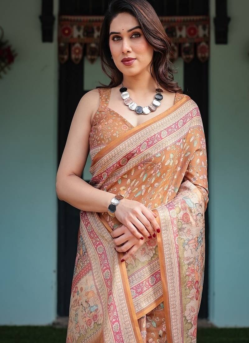 | Product Name | Brown Handloom Cotton Linen Saree With Floral Motifs And Rich Zari Border | |