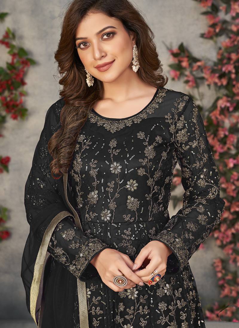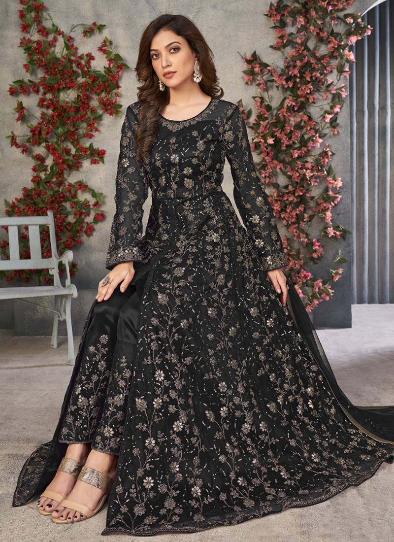 | Product Description | This Black Embroidered Anarkali Gown Set Delivers Pure Elegance, Grace, And Royal Charm In One Stunning Outfit. Designed For Women Who Love Timeless Ethnic Fashion, This Ensemble Creates A Rich, Luxurious Presence That Feels Perfect For Grand Occasions And Celebrations. The Outfit Features A Flowing Floor Length Anarkali Silhouette That Creates A Beautiful Flare From The Waist Down, Giving A Regal, Princess Like Look. The Deep Black Color Adds Richness And Warmth, Making The Outfit Feel Powerful, Festive, And Traditionally Royal. The Gown Is Beautifully Detailed With Dense Silver Floral Embroidery Spread Across The Entire Surface, Creating A Handcrafted Luxury Finish. The Embroidery Work Adds Depth, Texture, And Sparkle Without Looking Heavy, Making The Outfit Look Premium Yet Balanced. The Sheer Embroidered Sleeves Add Softness And Elegance, Giving The Outfit A Refined Designer Touch. The Matching Flowing Dupatta Completes The Look Perfectly, Adding Grace And Movement To The Outfit. It Enhances The Overall Silhouette And Makes The Ensemble Look Complete, Festive, And Ceremony Ready. |