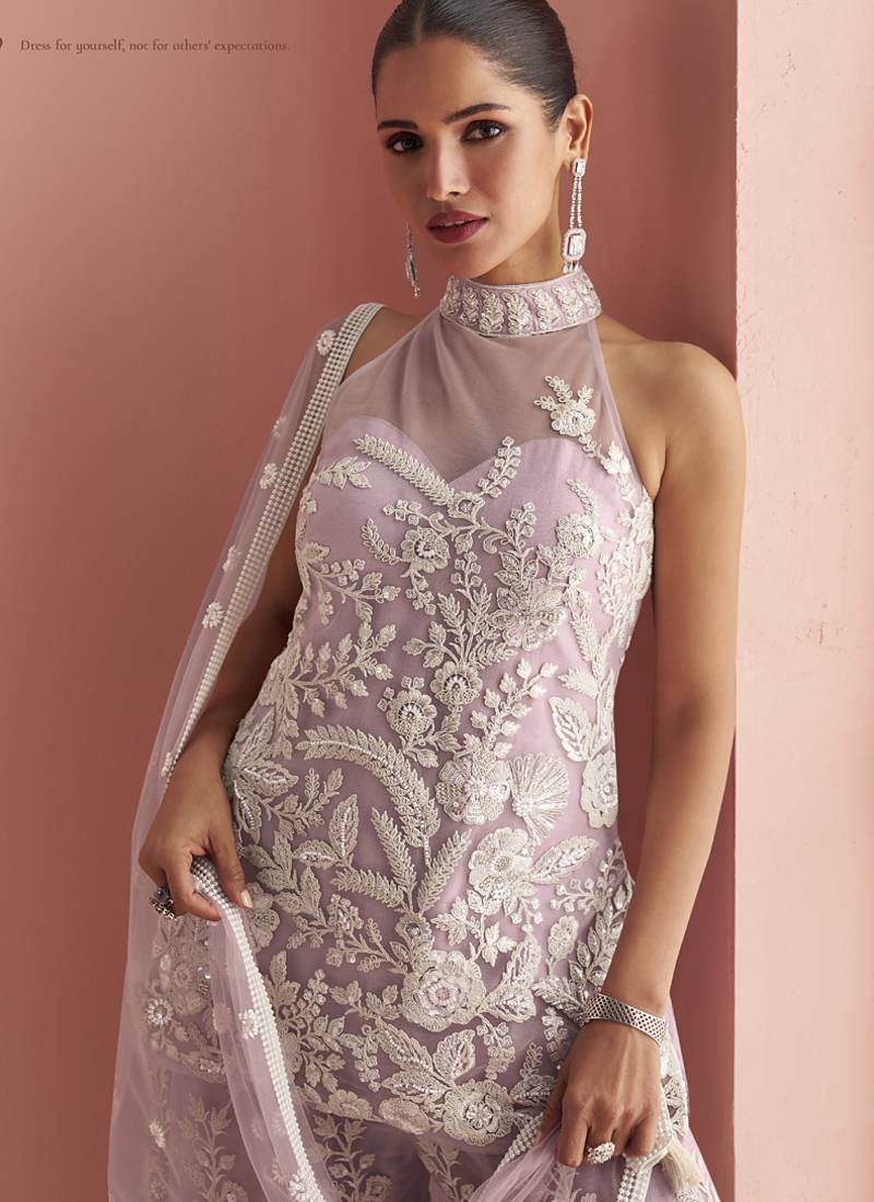 Light lavender net embroidered beads trendy plazzo suit stitched