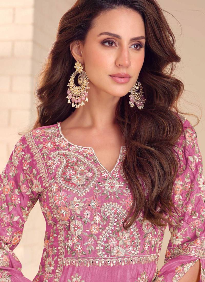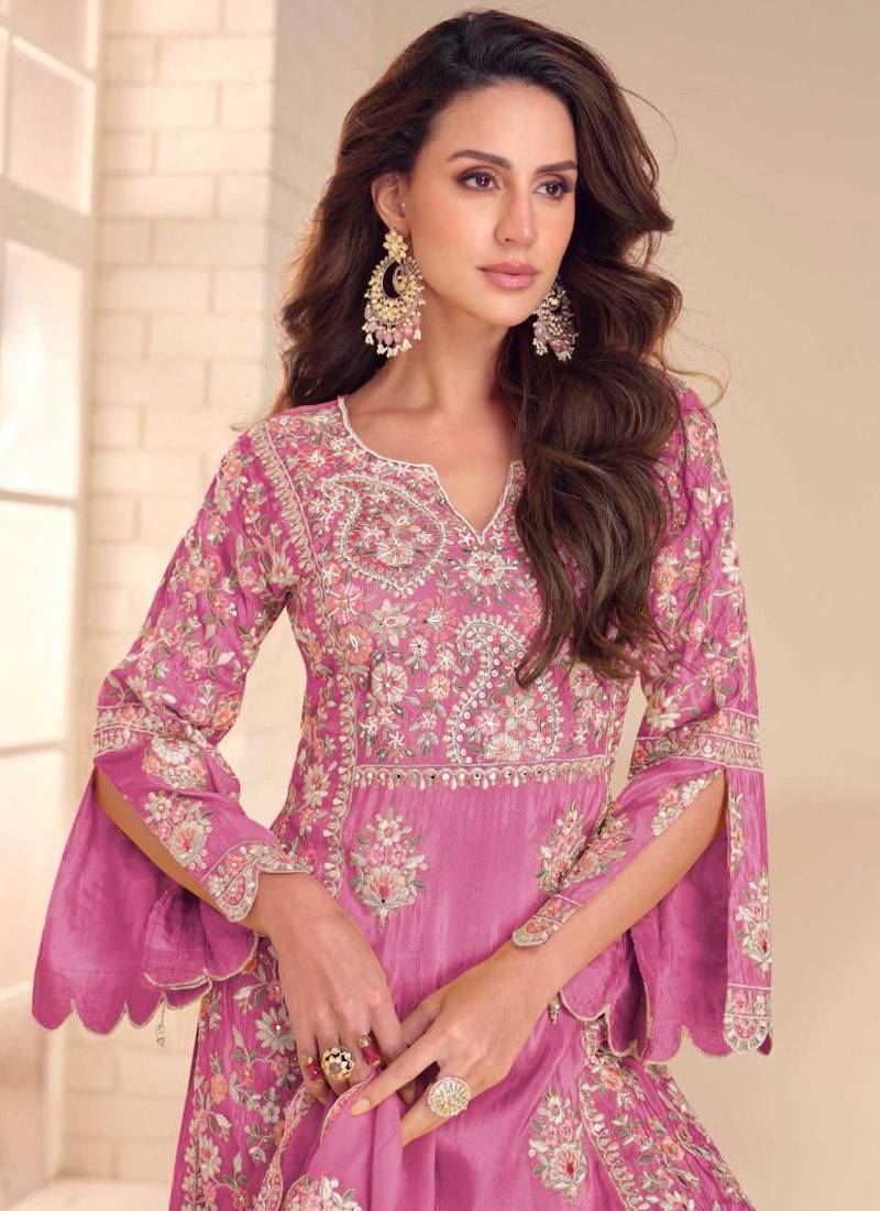 Onion pink simmer silk embroidered designer palazzo suit stitched