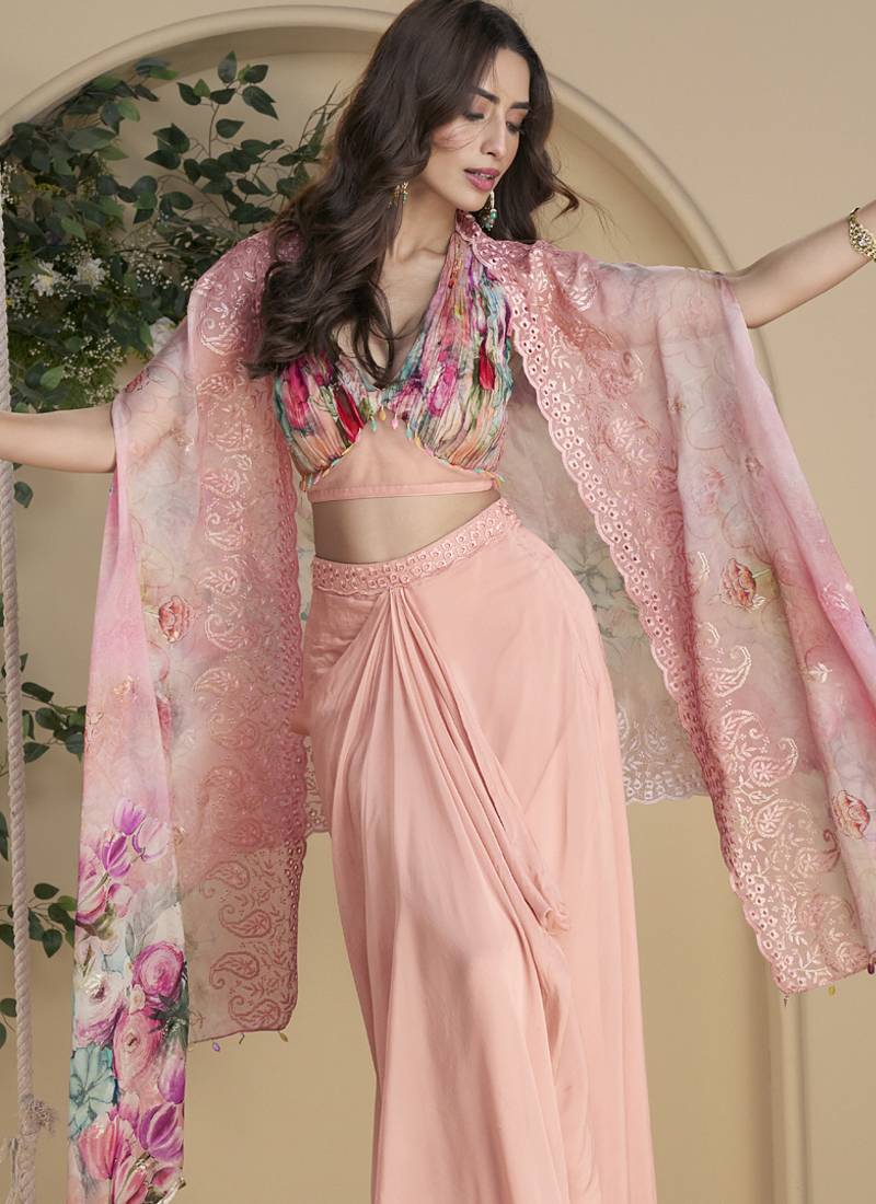Product Name | Peach Real Chinon Silk Embroidered Shrug Stytle Western Suit | |