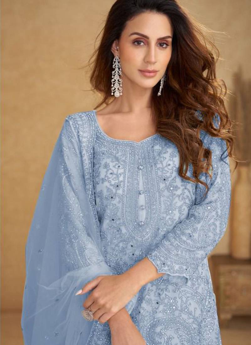 | Product Name | Sky Blue Net Embroidered Designer Plazzo Suit | |