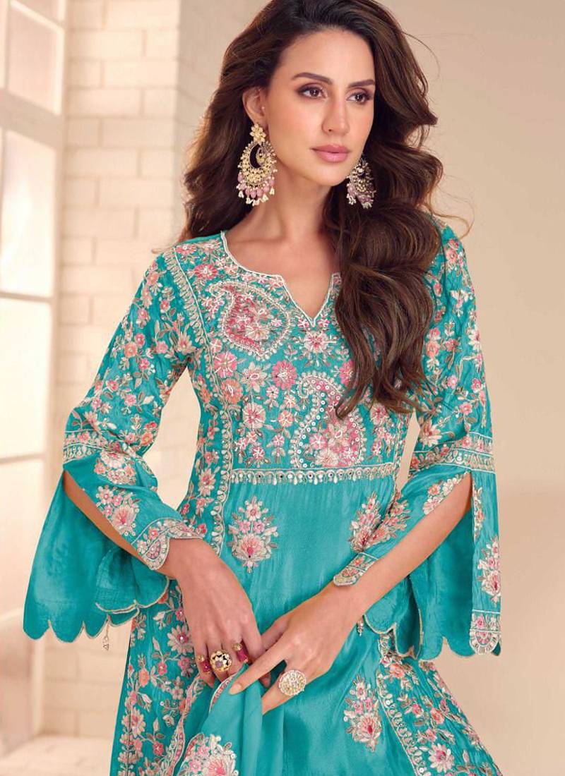 Sky blue simmer silk embroidered designer palazzo suit stitched