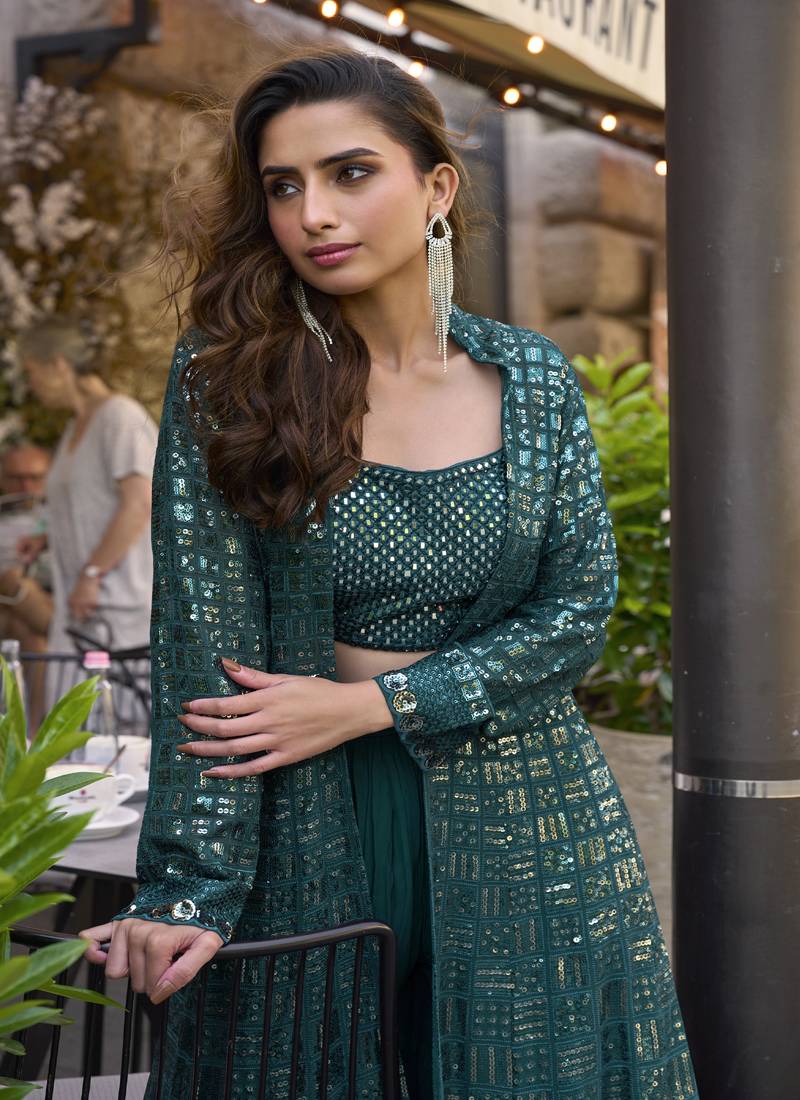 Teal green georgette embroidered western style plazzo suit stitched