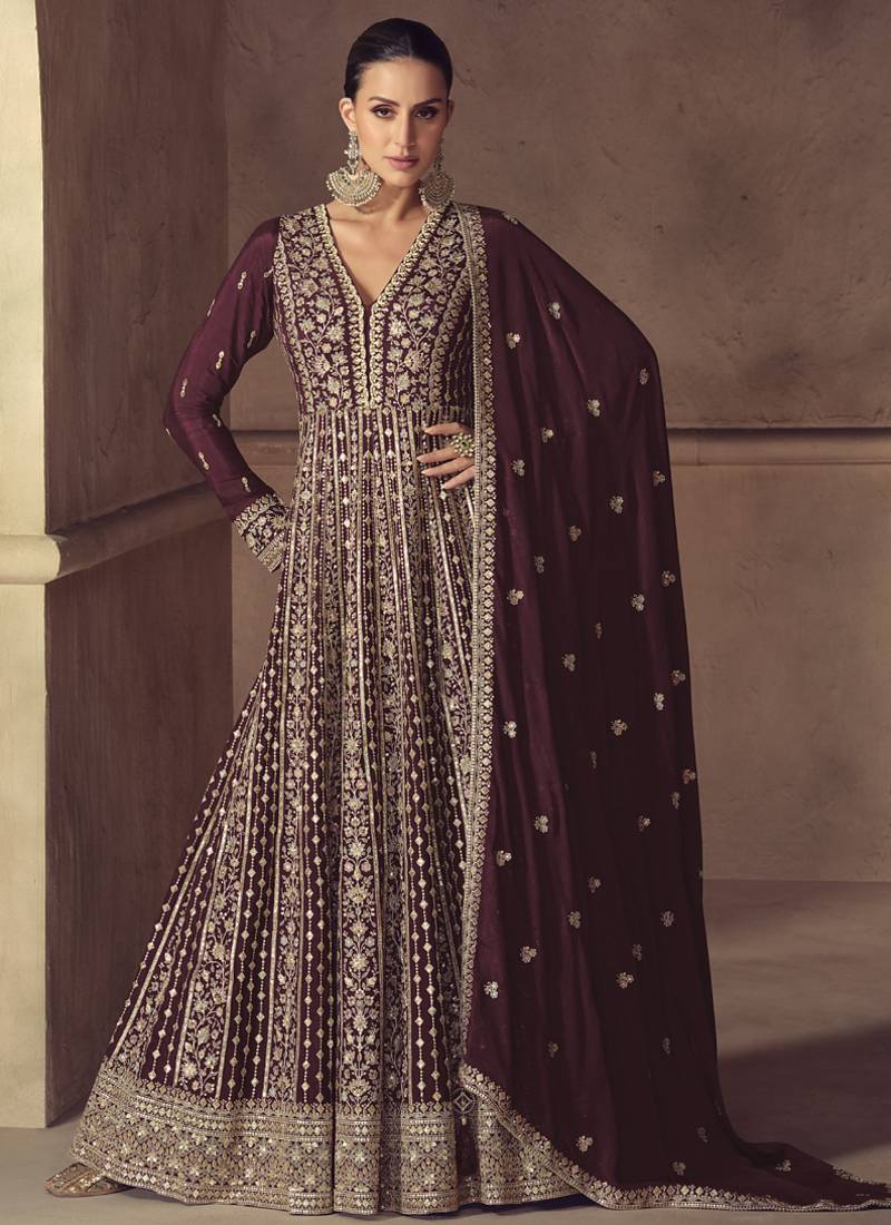 Product Name Wine Chinon Silk Embroidered Designer Anarkali Suit
