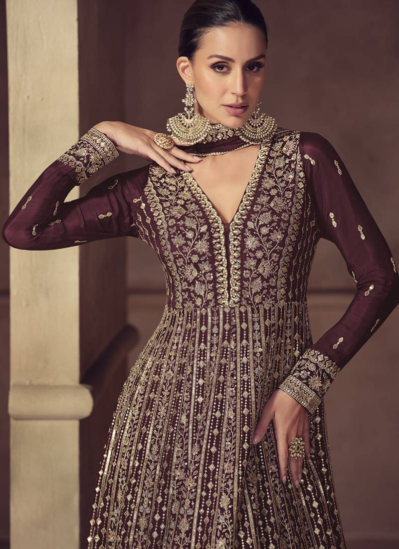 Wine chinon silk embroidered designer anarkali suit