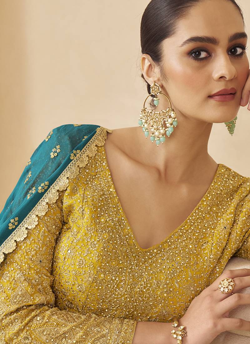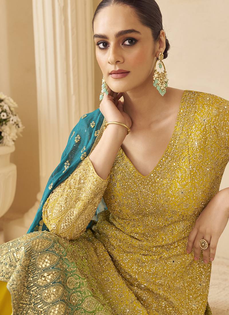 | Product Name | Yellow Georgette Embroidered Zarkan Work Palazzo Suit | |