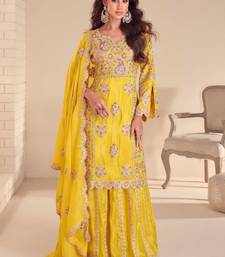 Yellow simmer silk embroidered designer plazzo suit stitched