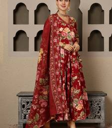 | Product Name | Red Floral Printed Cotton Three Piece Ethnic Set With Wrap Style Dress, Bottom & Dupatta | |