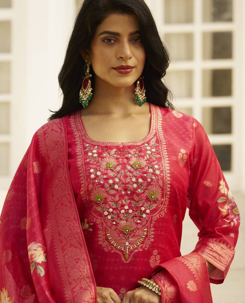 | • | Kameez | : | Color- Pink / Fabric- Silk Blend |