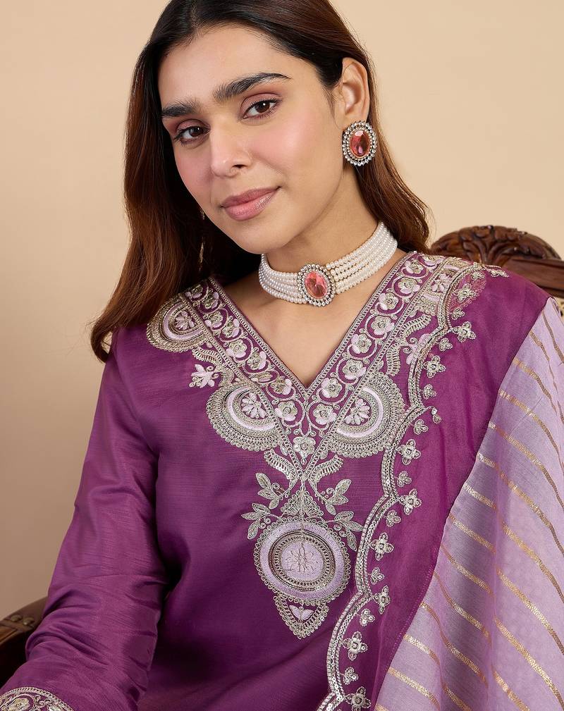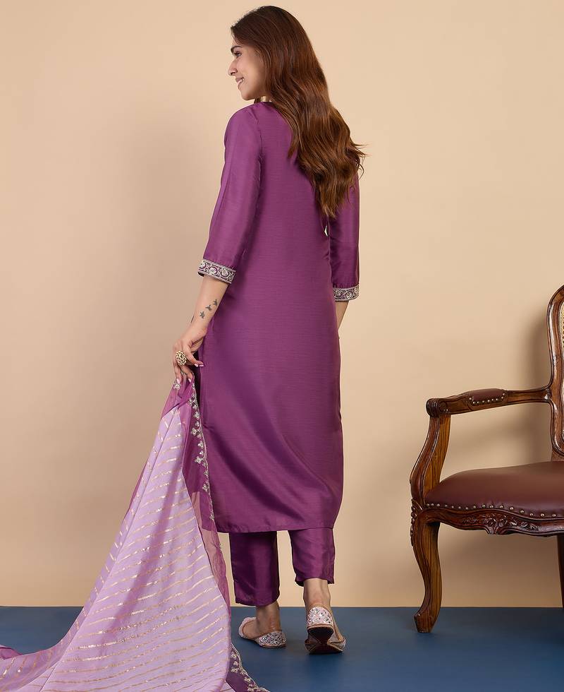 Enhance Your Ethnic Wardrobe With This Elegant Women’s Kurta Pant Dupatta Set, Designed To Offer A Perfect Blend Of Traditional Charm And Modern Style. This Beautiful Kurta Set For Women Features A Straight Fit Kurta With Intricate Embroidery On The Neckline And Sleeve Borders, Adding A Graceful And Festive Touch To The Outfit. Paired With Comfortable Matching Straight Pants, The Set Provides A Flattering And Stylish Silhouette Suitable For All Day Wear. The Look Is Completed With A Stylish Striped Dupatta With Embroidered Borders, Which Enhances The Overall Elegance Of The Ensemble. Crafted From Soft And Comfortable Fabric, This Ethnic Set For Women Is Ideal For Festive Occasions, Family Gatherings, Celebrations, And Traditional Events. Pair It With Statement Earrings And Ethnic Footwear To Create A Sophisticated And Timeless Traditional Look.