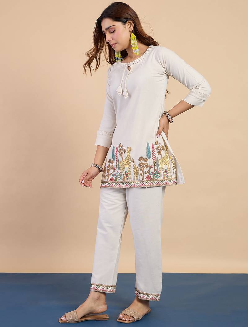This Co Ords Consists Of Shirt And Trouser. The Shirt Has Intricate Thread Work Embroidered Detailing. Solid Colour Mid Rise Trouser, Has Slip On Closure And Flared Hem. The Trouser Has Quirky Embroidery Design. The Fabric Is Pure Silk Blend Fabric. This Is The Most Ideal Outfit For Party Wear And Date Look. Our Products Are Made And Stitched Using High Grade Fabrics And Yarns Under The Strict Surveillance Of Our Well Versed Executives. It Is Capable Of Making You Look Gorgeous. Wear It And Put Your Step In The World Of Fashion. It Looks Stunning Every Time You Match It With Accessories.