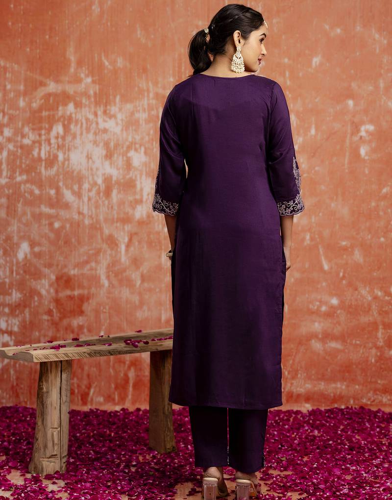 Women's embroidered silk blend kurta pant sets with dupatta stitched