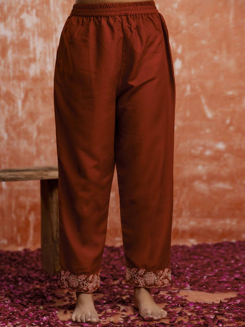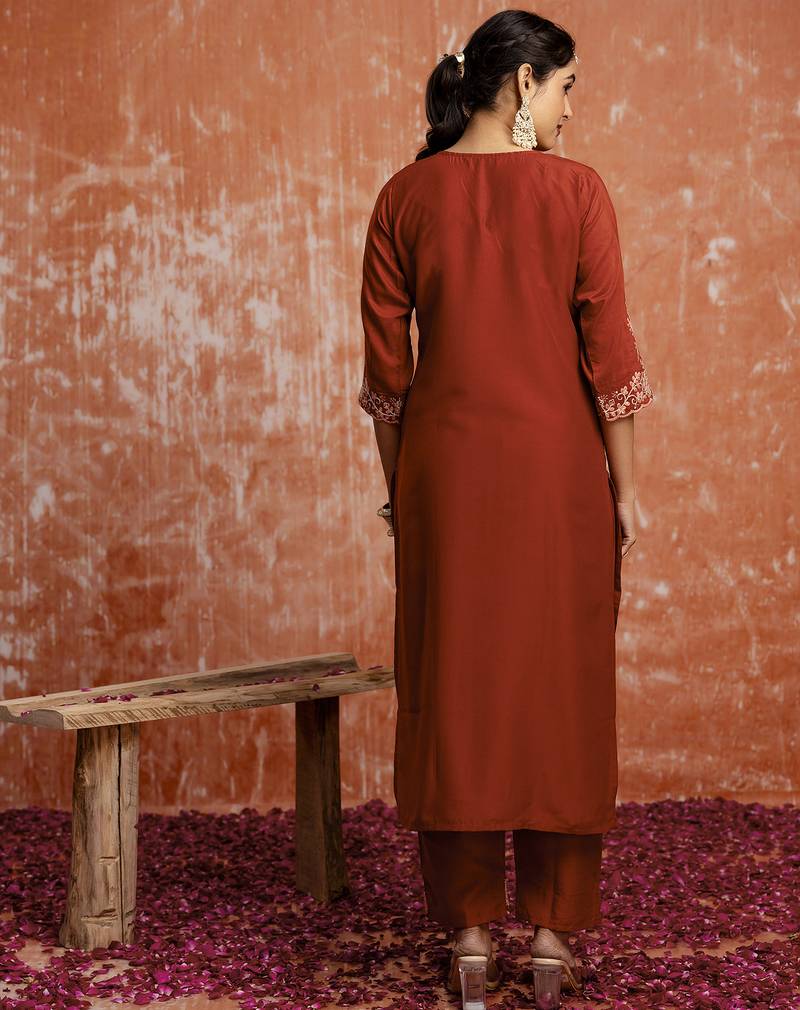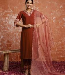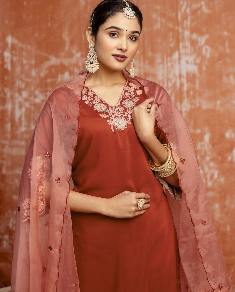 Women's embroidered silk blend kurta pant sets with dupatta stitched