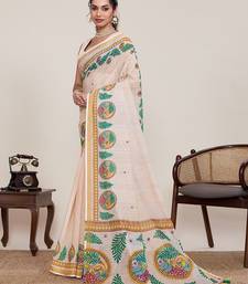 Beige linen printed saree with blouse