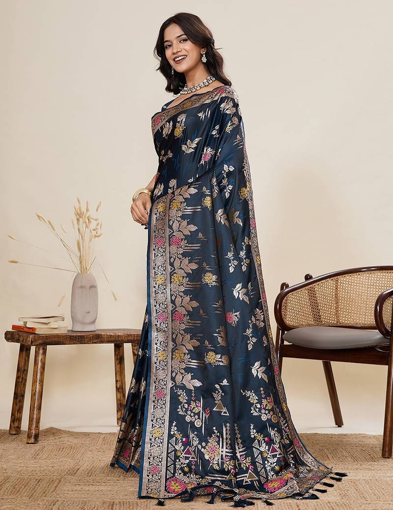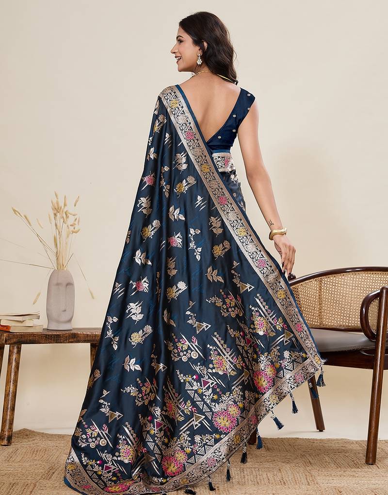 Product Name Navy Blue Silk Blend Printed Saree With Blouse