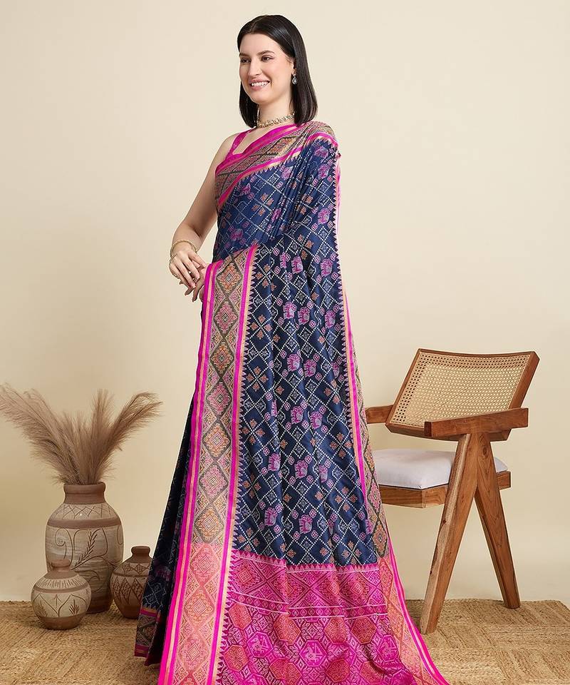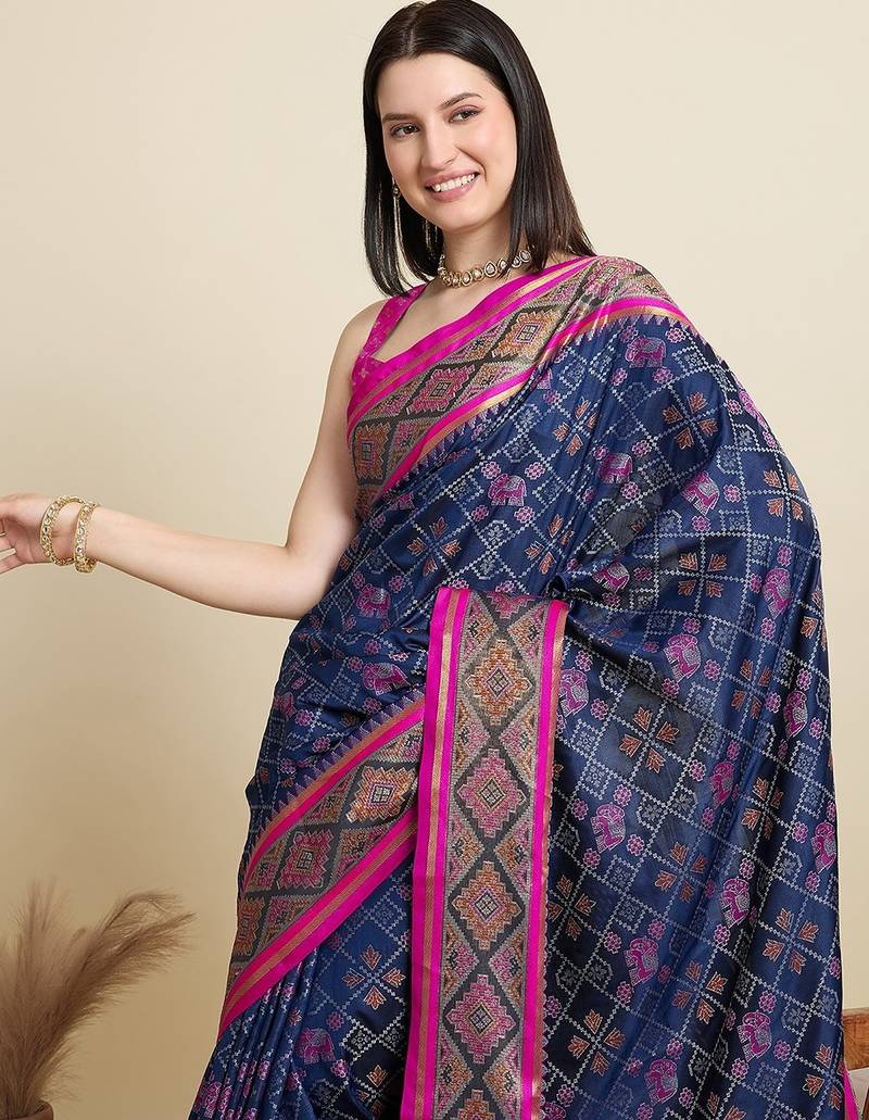 Navy blue silk blend blend printed saree with blouse