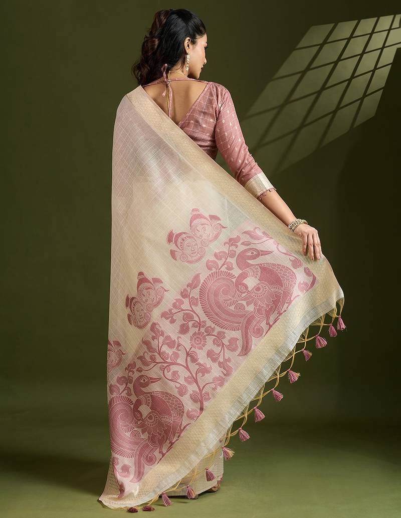 Premium Soft Muga Cotton Saree With Traditional Kalamkari Peacock Weaving Pallu And Weaving Figures On Border With All Over Checks Woven Pattern With Fancy Tassels And Contrast Blouse Piece