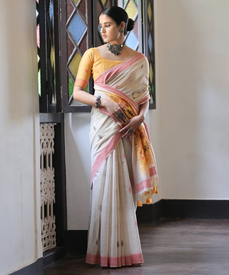 | Product Name | Cream Solid Blended Cotton Saree With Blouse | |