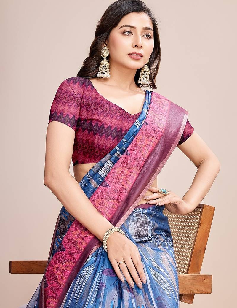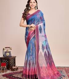 Teal linen printed saree with blouse