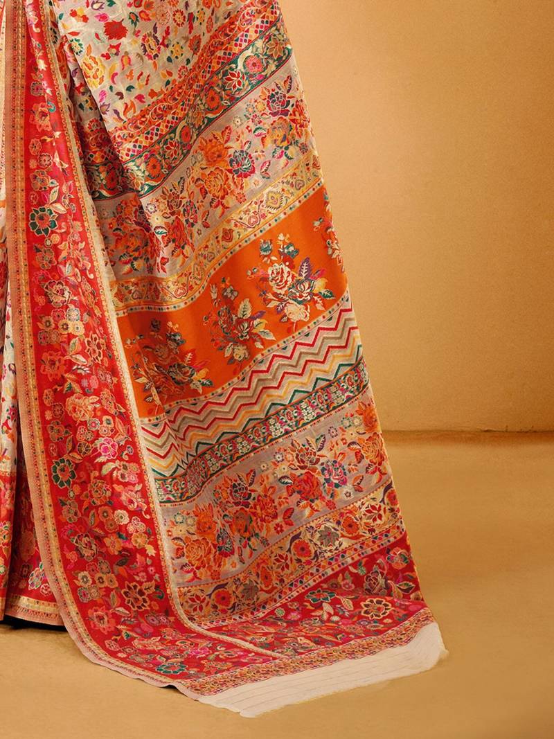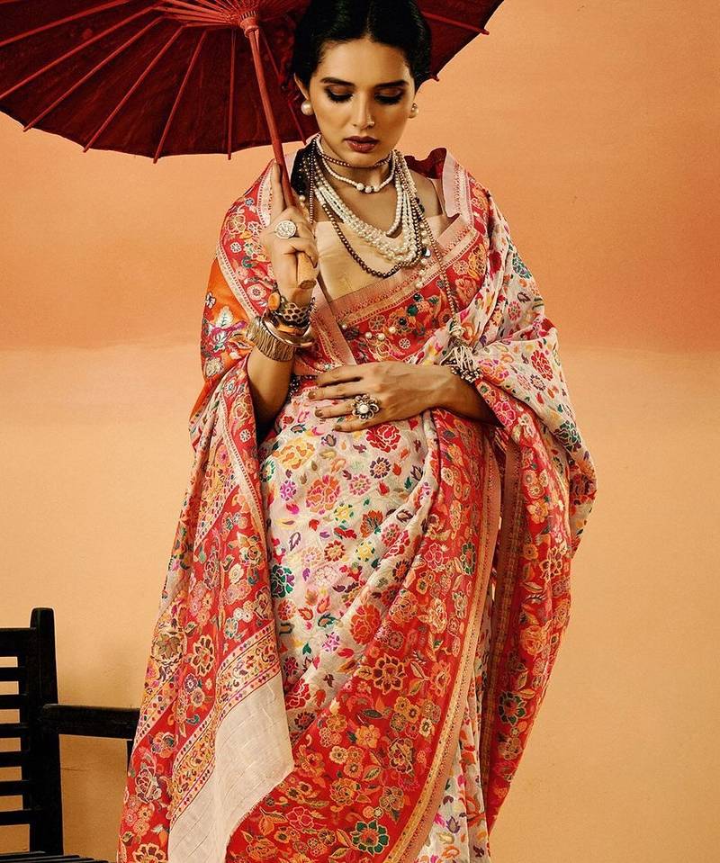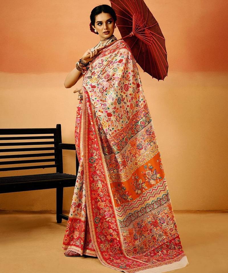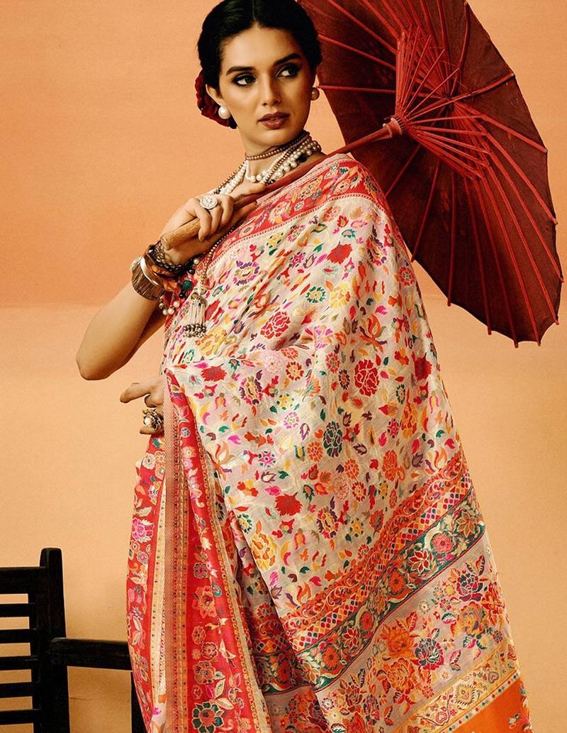 White pashmina cotton silk saree with diaphanous saree with blouse for women