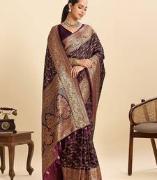 Wine satin printed saree with blouse