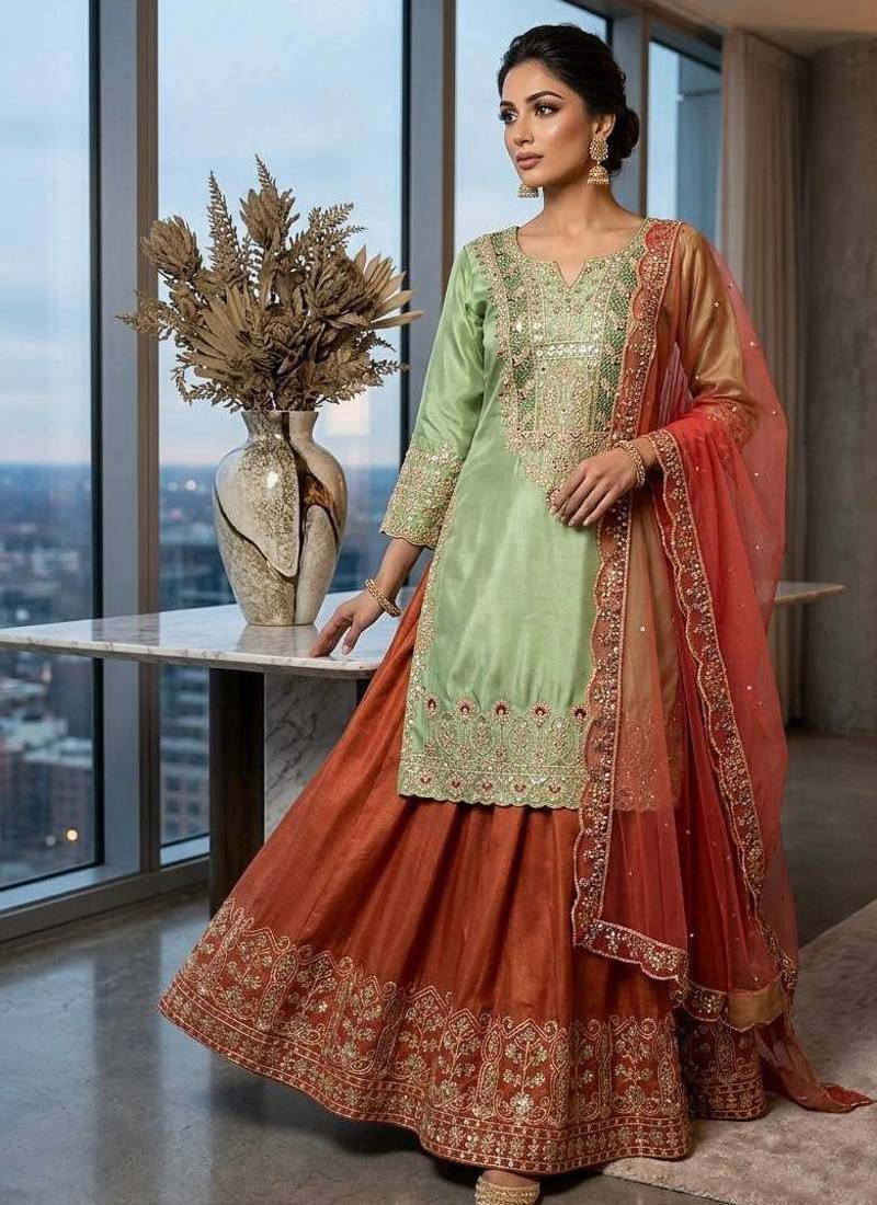 | Product Description | The Mint Green Kurta Is Beautifully Adorned With Heavy Cording And Sequins Work Across The Yoke, Sleeves, And Hem, Adding Rich Texture And Shimmer Without Feeling Overdone. It’s Paired With A Rust Toned Plazzo That Balances The Look With A Warm Contrast, Finished With A Matching Embroidered Border For A Cohesive Finish. Completing The Ensemble Is A Soft Organza Dupatta In A Delicate Orange Hue, Highlighted By A Scalloped Sequins Edge That Adds A Graceful, Flowy Charm. |