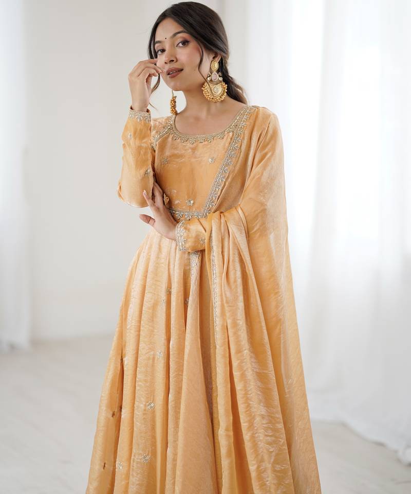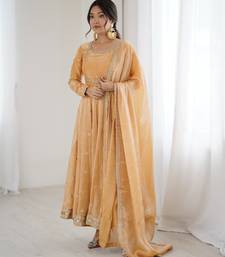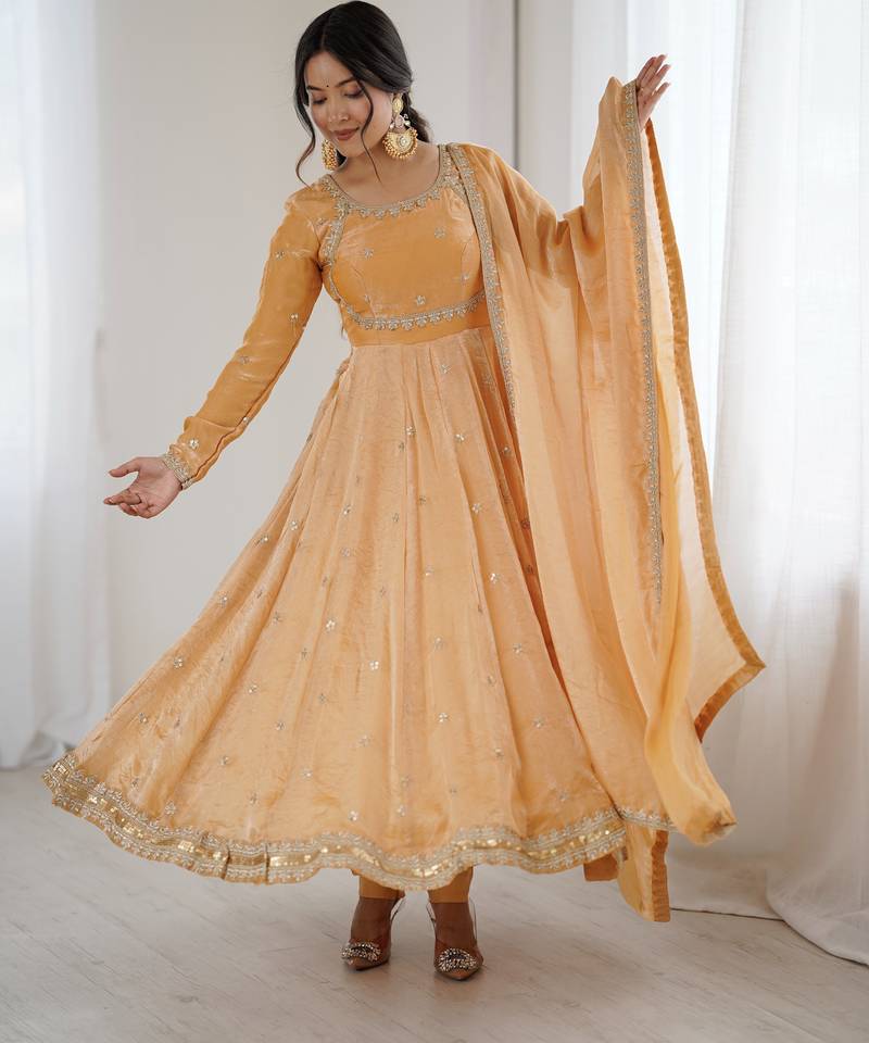 | Product Name | Beige Fandy Silk Anarkali Gown Set With Cording & Sequence Work | |