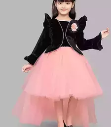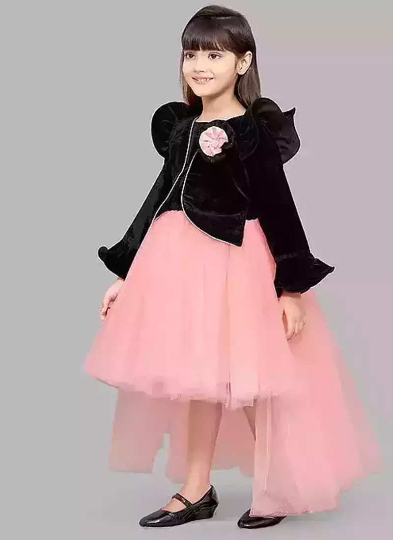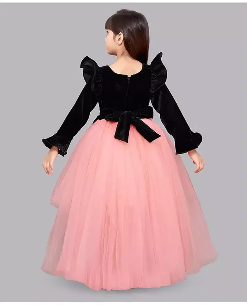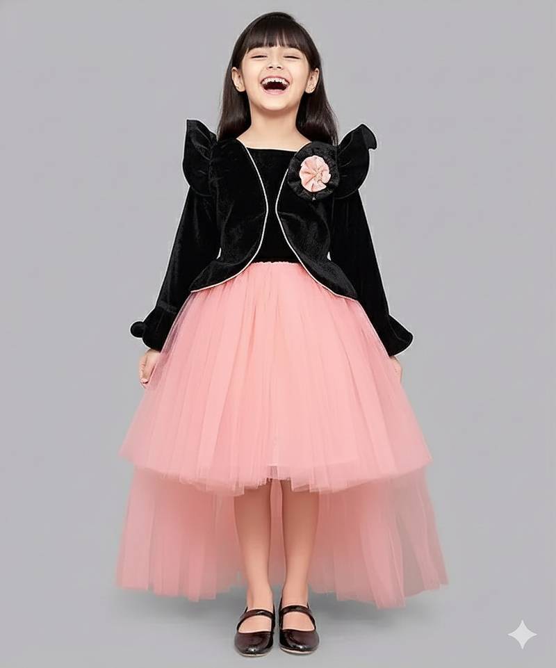 | Product Description | This Dress Is A Girls' Black Velvet And Peach/Pink Hi Low Jacket Style Gown. It Features A Black Velvet Bodice And A Layered, Asymmetrical Tulle Skirt That Is Shorter In The Front And Longer In The Back. |