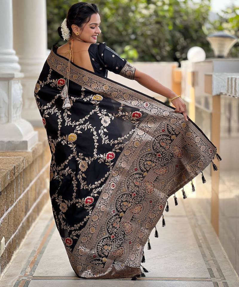 Black elegant art silk woven saree with rich zari border