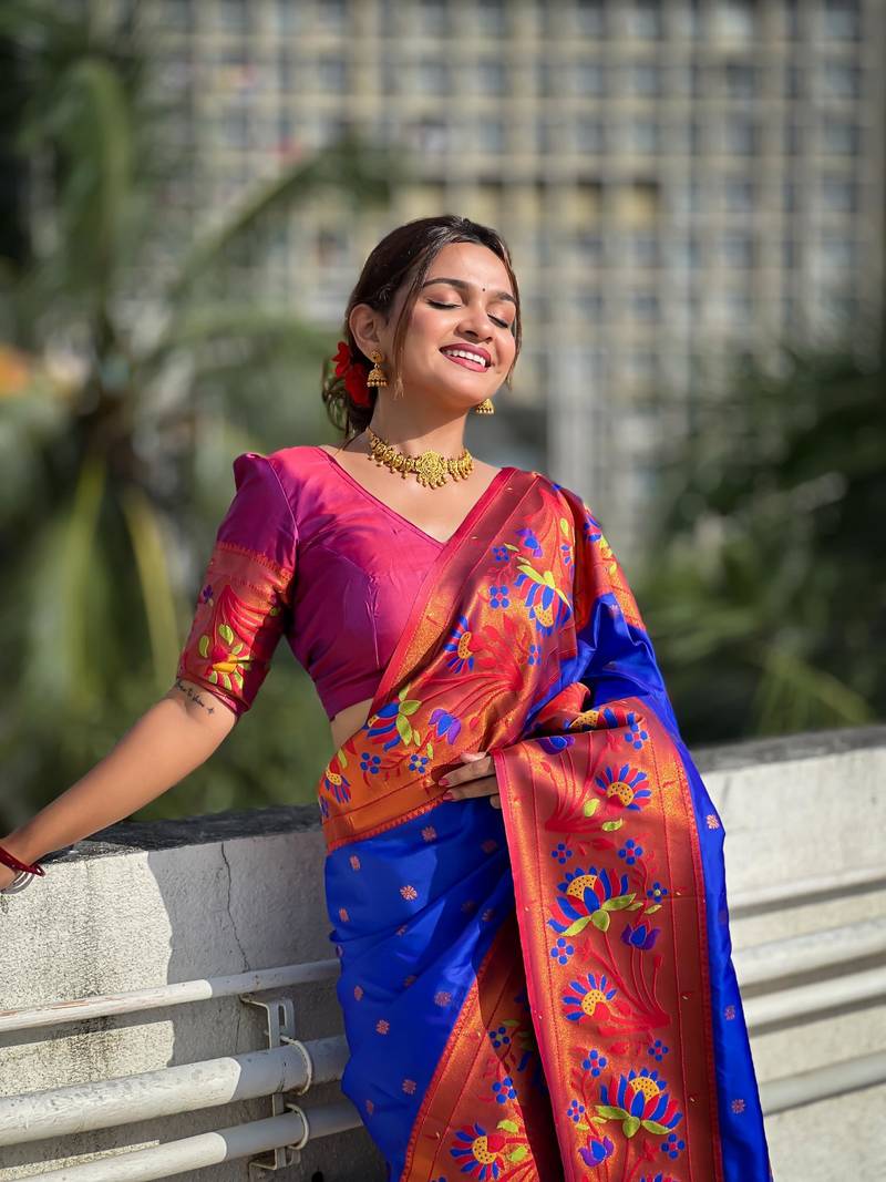 | Product Description | Soft Paithani Silk Saree With Zari Weawing Meenakari Motifs Design And Meenakari Weawing Rich Pallu With Meenakari Weawing Border & Tassels Attached At Pallu End. Blouse : Enrich Silk Weawing Contrast Blouse Piece With Sleeve Border , |