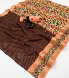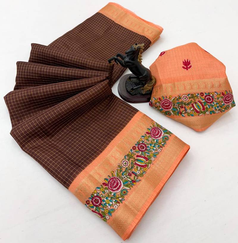 Product Name Brown Spice Silk Saree With Zari Border, Check Design & Floral Pallu