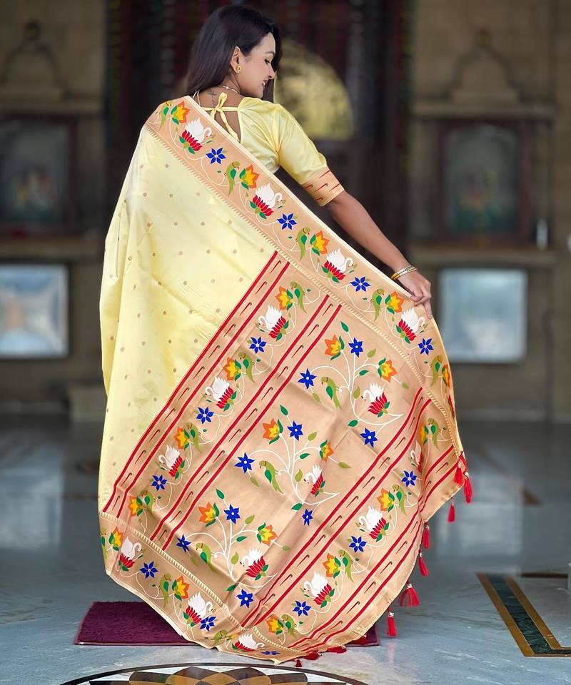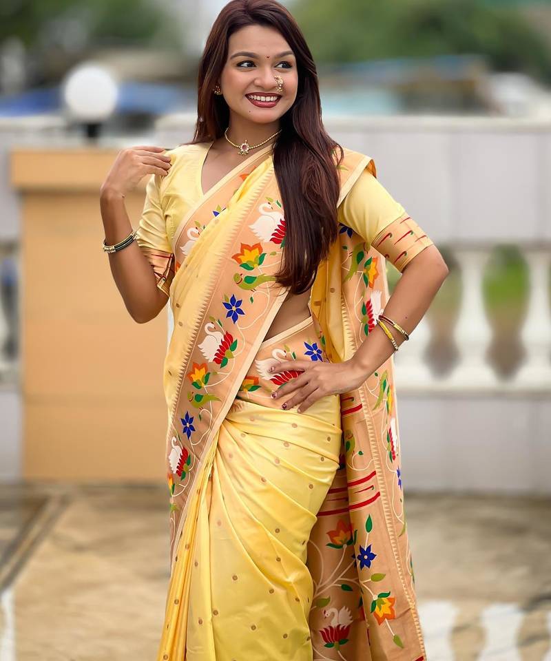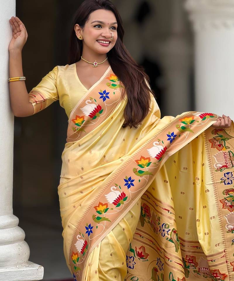 | Product Description | Soft Paithani Silk Saree With Zari Weawing Motifs Design And Meenakari Weawing Rich Pallu With Meenakari Weawing Border & Tassels Attached At Pallu End. Blouse : Enrich Silk Weawing Contrast Blouse Piece With Sleeve Border , |