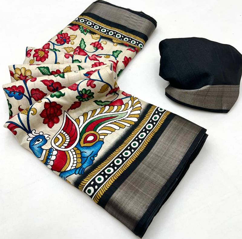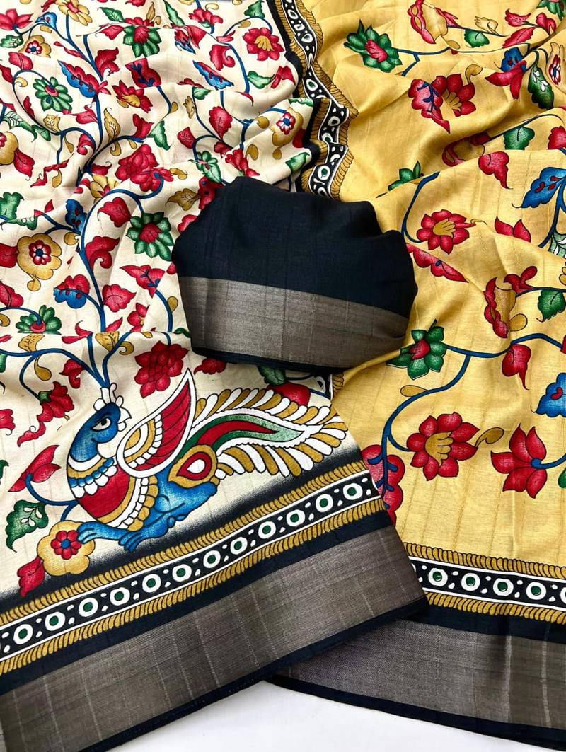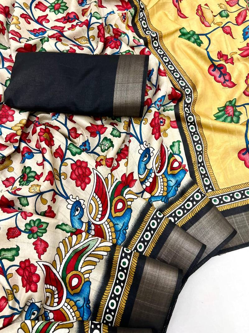 | Product Name | Cream Malai Cotton Saree With Kalamkari Print & Peacock Pallu | |