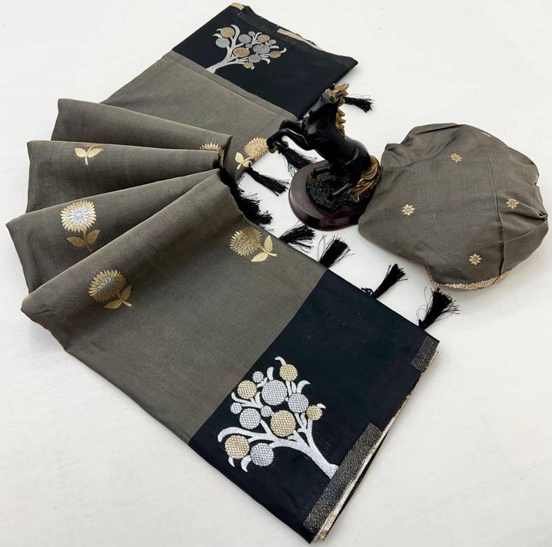 | Product Name | Dark Grey Soft Silk Saree With Zari Weaving & Floral Motifs | |