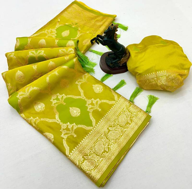 | Product Name | Lemon Banarasi Satin Mashroo Silk Saree With Multicolor Zari Motifs | |