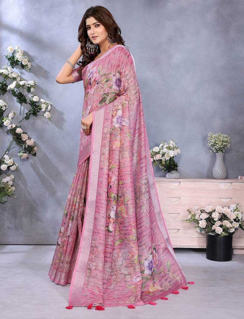 Light baby pink printed art silk designer pallu saree