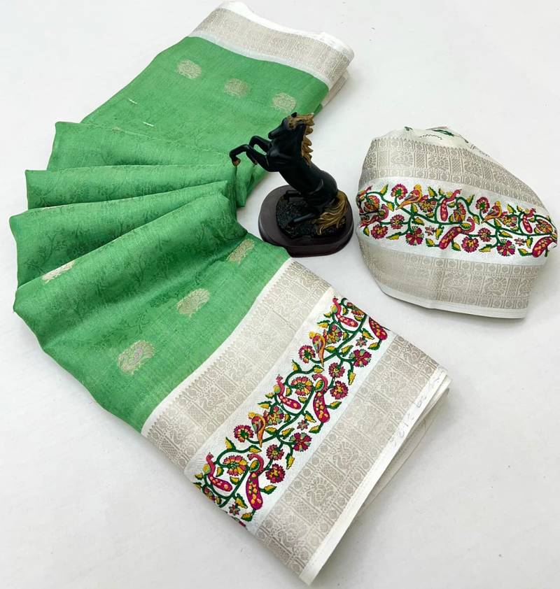 Light green soft tussar silk saree with zari butti & kashmiri style woven border