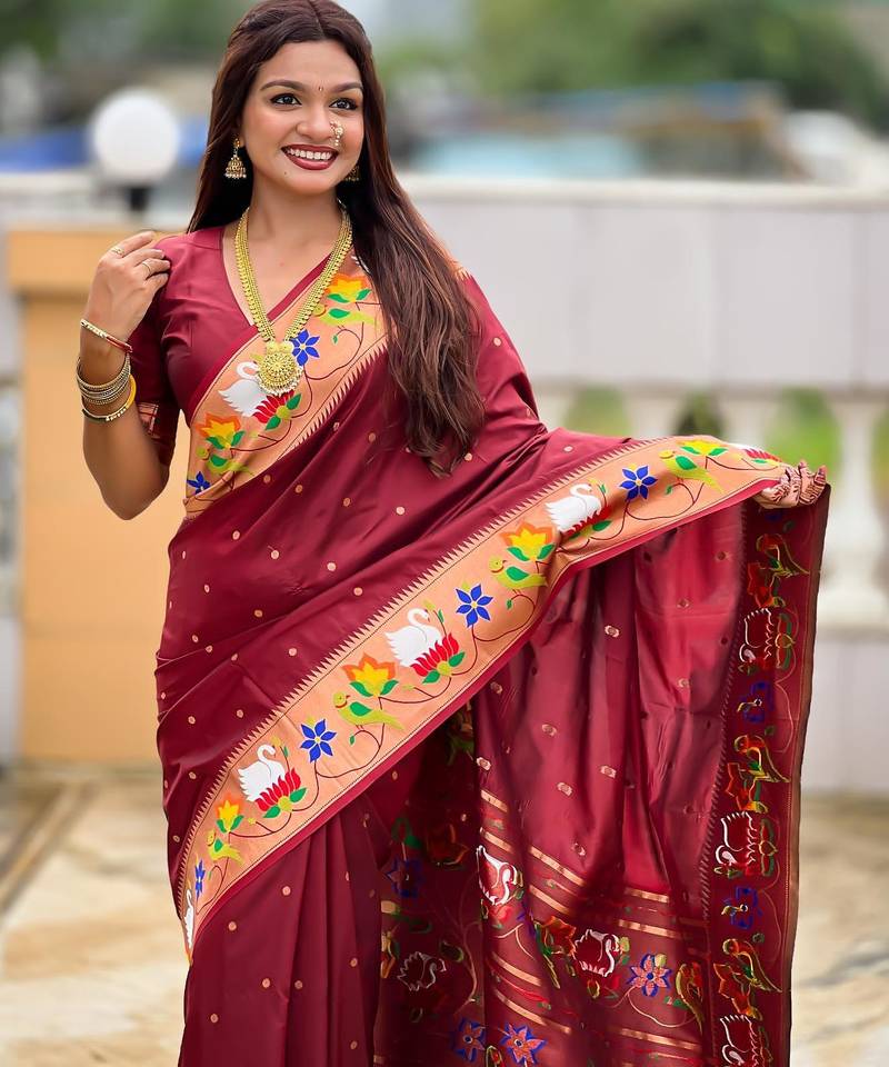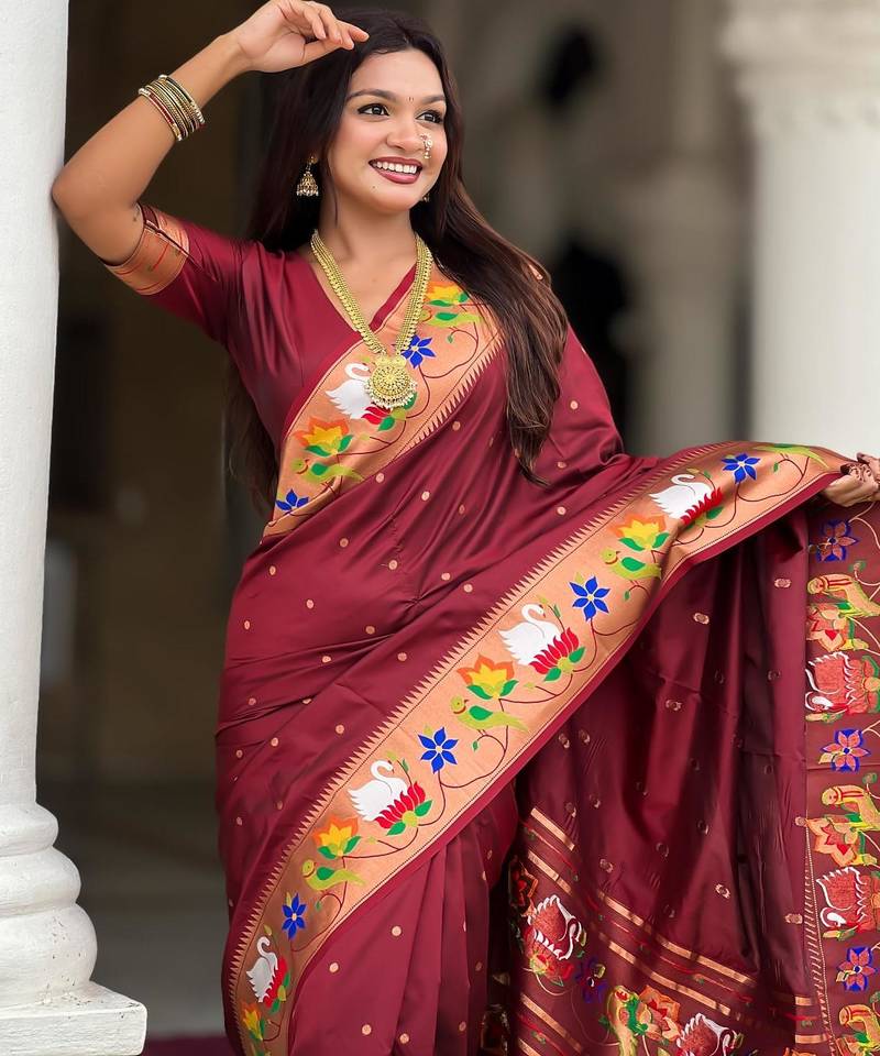 | Product Description | Soft Paithani Silk Saree With Zari Weawing Motifs Design And Meenakari Weawing Rich Pallu With Meenakari Weawing Border & Tassels Attached At Pallu End. Blouse : Enrich Silk Weawing Contrast Blouse Piece With Sleeve Border , |