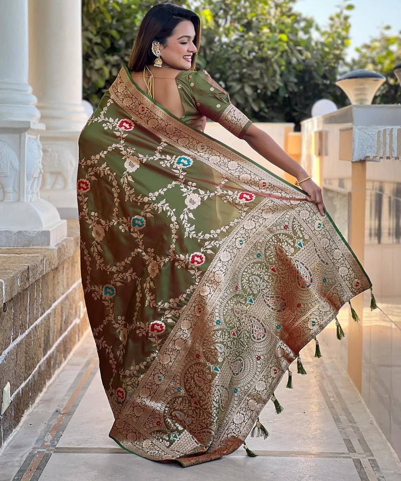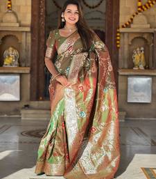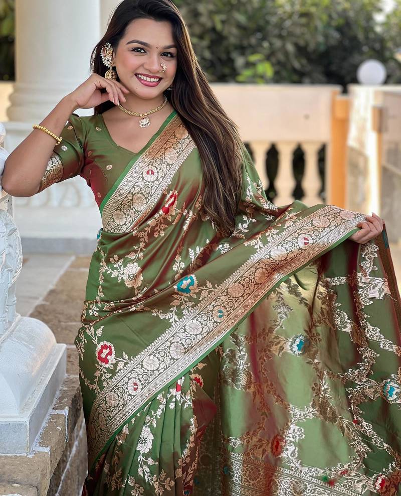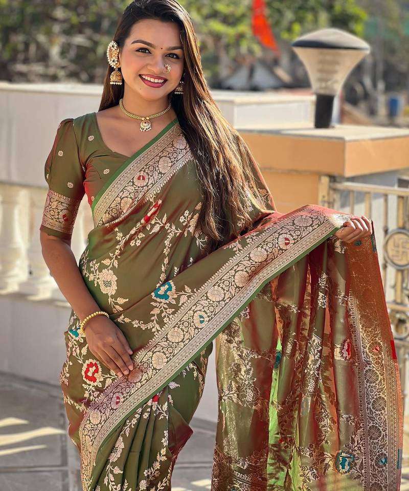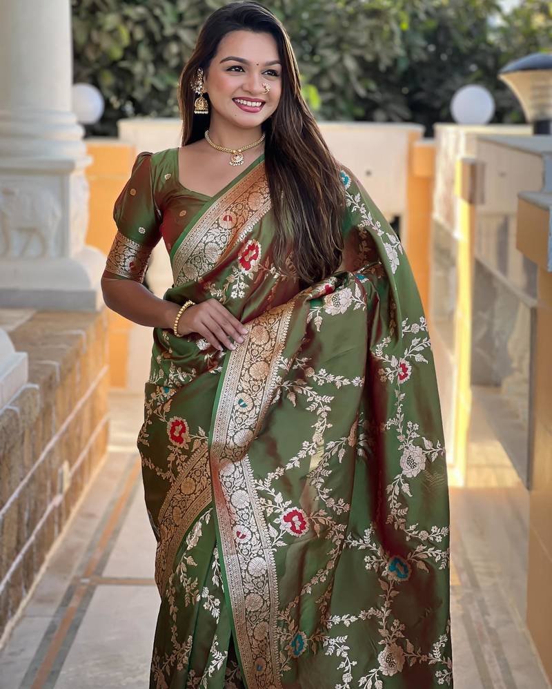 Mehendi elegant art silk woven saree with rich zari border