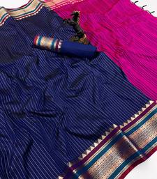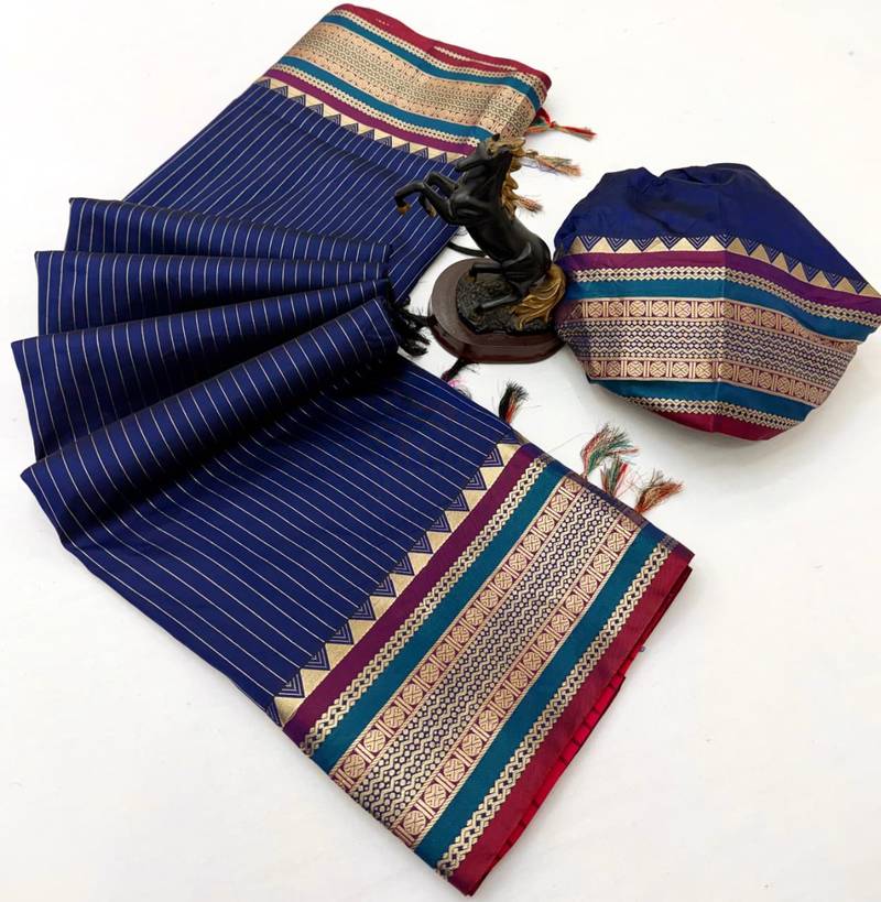 Navy blue munga silk saree with zari stripe design & designer border