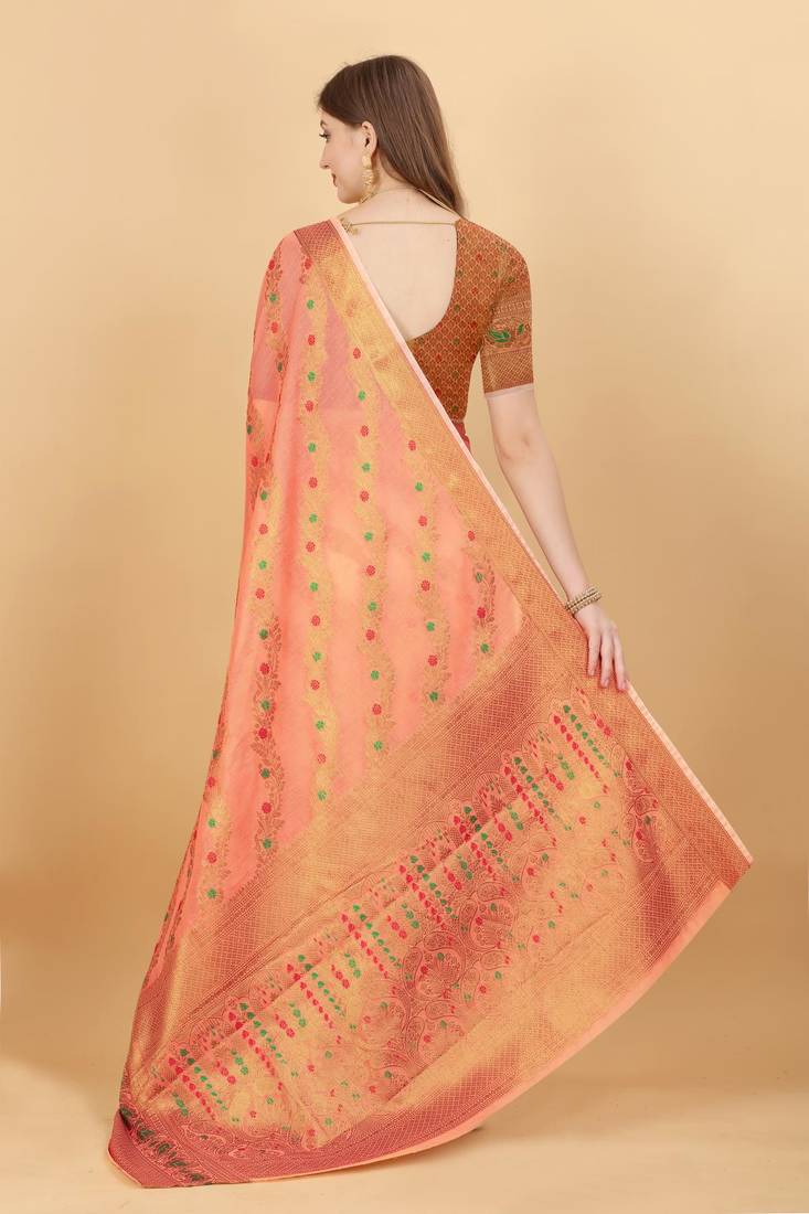 | Product Description | Soft Cotton Saree With Zari Weawing Design And Rich Zari Weawing Pallu With Zari Weawing Border , Blouse : Silk Weawing Blouse Piece |