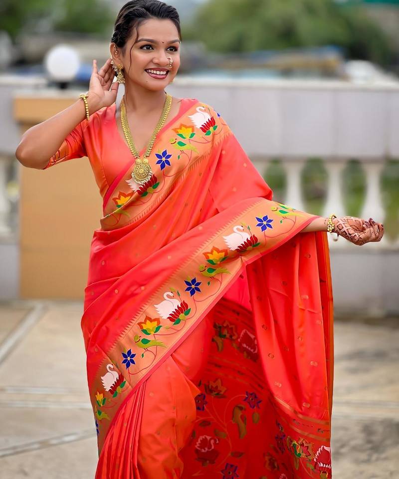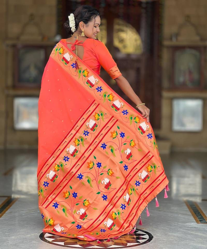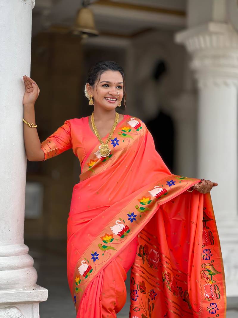 Orange elegant art silk woven saree with rich zari border
