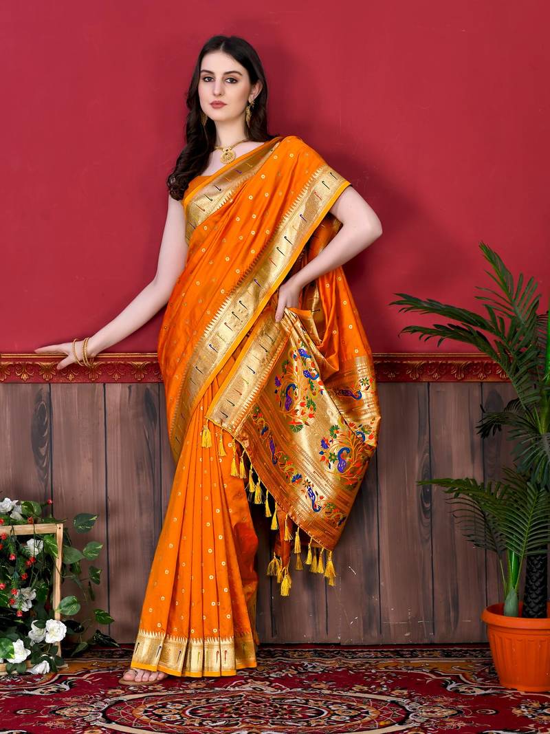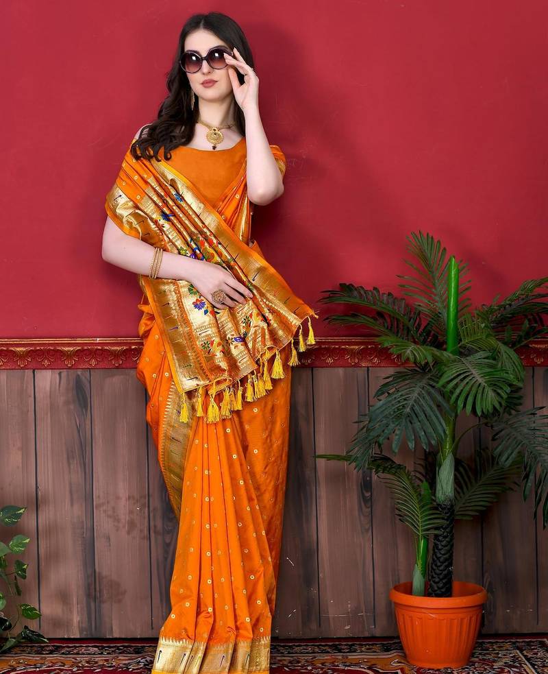 | Product Description | Soft Paithani Silk Saree With Zari Weawing Meenakari Motifs Design And Meenakari Weawing Rich Pallu With Meenakari Weawing Border & Tassels Attached At Pallu End. Blouse : Enrich Silk Weawing Contrast Blouse Piece With Sleeve Border , |